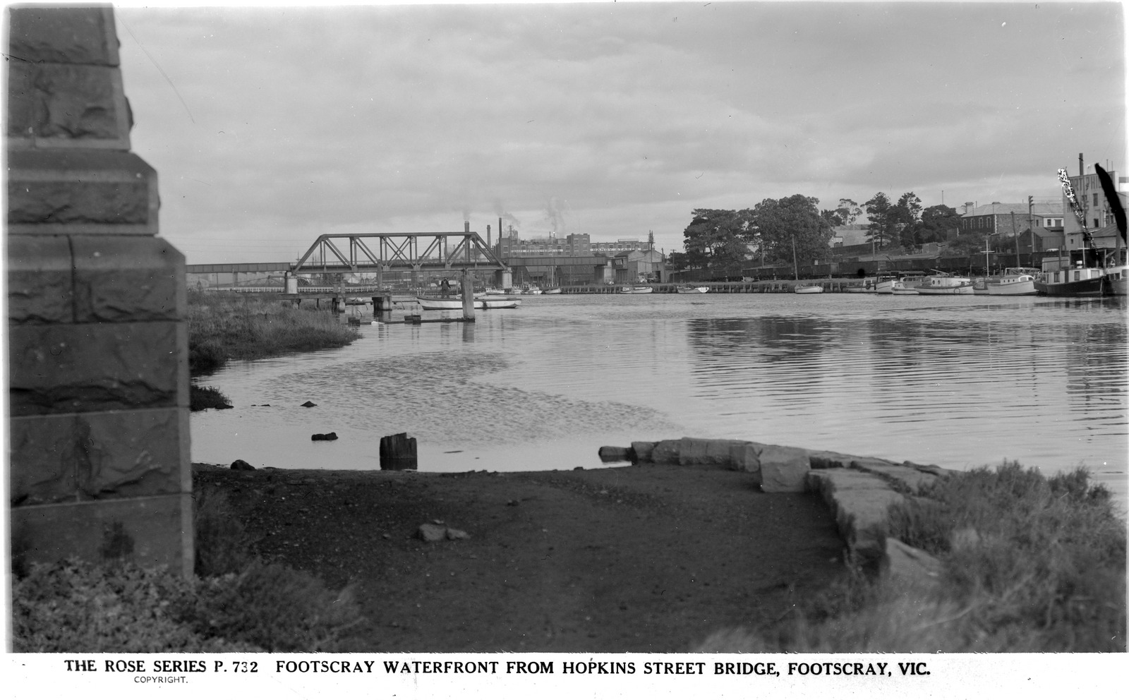 Footscray waterfront from Hopkins St Bridge, photograph from the Rose Series, c. 1920-1955.